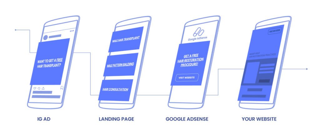 As we investigated, we discovered these leads were coming from a deceptive ad promising free procedures from “med school graduates”. Here’s how the scam works: The scammer creates an ad offering free hair transplants, using language designed to entice potential patients. When users click the ad, they’re taken to a generic landing page filled with Google AdSense ads. What is Google AdSense? It’s a program that allows website owners to display Google Ads on their pages, generating revenue when users click those ads. It’s often used to monetize blogs or websites that curate news. In this case, the scammer is exploiting the program to profit from fraudulent clicks.